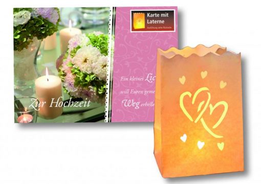 Die Laternenkarten aus dem Hause des Brunnen-Verlages bieten beides in besonderer Weise. Jede Faltkarte ziert nicht nur ein stimmungsvolles Fotomotiv, klappt man die Karte auf, enthält sie eine kleine Laterne in den Maßen 16 x 11 x 11 cm, aus schwer entflammbarem Papier, mit ausgestanztem Bildmotiv. Egal, ob drinnen oder draußen, als Tischdekoration oder Festplatzbeleuchtung: Das gemütlich-flackernde Kerzenlicht sorgt zu später Stunde für eine heimelige Atmosphäre und lässt das Brautpaar garantiert immer an Sie und das tolle Geschenk zu ihrer Eheschließung denken. Mit dieser Laternenkarte verschenken Sie herzliche Stunden zu Zweit an das frisch vermählte Brautpaar.